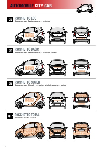 AUTOMOBILE CITY CARPACCHETTO ECO Decorazione su n. 2 portiere anteriori + posteriore.PACCHETTO BASICDecorazione su n. 2 portiere anteriori + posteriore + cofano.PACCHETTO SUPERDecorazione su n. 2 laterali + n. 2 portiere anteriori + posteriore + cofano.PACCHETTO TOTALDecorazione su tutto il veicoloQ2Q4Q8Q1210