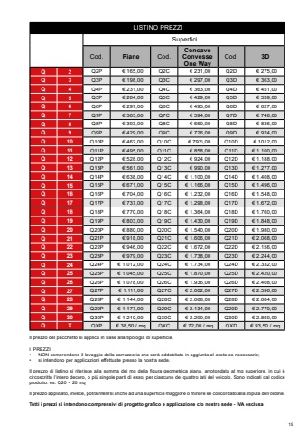LISTINO PREZZI SuperficiCod. Piane Cod.ConcaveConvesseOne WayCod. 3D Q 2 Q2P %u20ac 165,00 Q2C %u20ac 231,00 Q2D %u20ac 275,00 Q 3 Q3P %u20ac 198,00 Q3C %u20ac 297,00 Q3D %u20ac 363,00 Q 4 Q4P %u20ac 231,00 Q4C %u20ac 363,00 Q4D %u20ac 451,00 Q 5 Q5P %u20ac 264,00 Q5C %u20ac 429,00 Q5D %u20ac 539,00 Q 6 Q6P %u20ac 297,00 Q6C %u20ac 495,00 Q6D %u20ac 627,00 Q 7 Q7P %u20ac 363,00 Q7C %u20ac 594,00 Q7D %u20ac 748,00 Q 8 Q8P %u20ac 393,00 Q8C %u20ac 660,00 Q8D %u20ac 836,00 Q 9 Q9P %u20ac 429,00 Q9C %u20ac 726,00 Q9D %u20ac 924,00 Q 10 Q10P %u20ac 462,00 Q10C %u20ac 792\\,00 Q10D %u20ac 1012,00 Q 11 Q11P %u20ac 495,00 Q11C %u20ac 858,00 Q11D %u20ac 1.100,00 Q 12 Q12P %u20ac 528,00 Q12C %u20ac 924,00 Q12D %u20ac 1.188,00 Q 13 Q13P %u20ac 561,00 Q13C %u20ac 990,00 Q13D %u20ac 1.277,00 Q 14 Q14P %u20ac 638,00 Q14C %u20ac 1.100,00 Q14D %u20ac 1.408,00 Q 15 Q15P %u20ac 671,00 Q15C %u20ac 1.166,00 Q15D %u20ac 1.496,00 Q 16 Q16P %u20ac 704,00 Q16C %u20ac 1.232,00 Q16D %u20ac 1.548,00 Q 17 Q17P %u20ac 737,00 Q17C %u20ac 1.298,00 Q17D %u20ac 1.672,00 Q 18 Q18P %u20ac 770,00 Q18C %u20ac 1.364,00 Q18D %u20ac 1.760,00 Q 19 Q19P %u20ac 803,00 Q19C %u20ac 1.430,00 Q19D %u20ac 1.848,00 Q 20 Q20P %u20ac 880,00 Q20C %u20ac 1.540,00 Q20D %u20ac 1.980,00 Q 21 Q21P %u20ac 918,00 Q21C %u20ac 1.606,00 Q21D %u20ac 2.068,00 Q 22 Q22P %u20ac 946,00 Q22C %u20ac 1.672,00 Q22D %u20ac 2.156,00 Q 23 Q23P %u20ac 979,00 Q23C %u20ac 1.738,00 Q23D %u20ac 2.244,00 Q 24 Q24P %u20ac 1.012,00 Q24C %u20ac 1.734,00 Q24D %u20ac 2.332,00 Q 25 Q25P %u20ac 1.045,00 Q25C %u20ac 1.870,00 Q25D %u20ac 2.420,00 Q 26 Q26P %u20ac 1.078,00 Q26C %u20ac 1.936,00 Q26D %u20ac 2.408,00 Q 27 Q27P %u20ac 1.111,00 Q27C %u20ac 2.002,00 Q27D %u20ac 2.596,00 Q 28 Q28P %u20ac 1.144,00 Q28C %u20ac 2.068,00 Q28D %u20ac 2.684,00 Q 29 Q29P %u20ac 1.177,00 Q29C %u20ac 2.134,00 Q29D %u20ac 2.770,00 Q 30 Q30P %u20ac 1.210,00 Q30C %u20ac 2.200,00 Q30D %u20ac 2.860,00 Q X QXP %u20ac 38,50 / mq QXC %u20ac 72,00 / mq QXD %u20ac 93,50 / mqTutti i prezzi si intendono comprensivi di progetto grafico e applicazione c/o nostra sede - IVA esclusaIl prezzo del pacchetto si applica in base alla tipologia di superficie.I PREZZI:%u2022 NON comprendono il lavaggio della carrozzeria che sar%u00e0 addebitato in aggiunta al costo se necessario;%u2022 si intendono per applicazioni effettuate presso la nostra sede.Il prezzo di listino si riferisce alla somma dei mq della figura geometrica piana, arrotondata al mq superiore, in cui %u00e8 circoscritto l%u2019intero decoro, o pi%u00f9 singole parti di esso, per ciascuno dei quattro lati del veicolo. Sono indicati dal codice prodotto: es. Q20 = 20 mqIl prezzo applicato, invece, potr%u00e0 riferirsi anche ad una superficie maggiore o minore se concordato alla stipula dell%u2019ordine.15