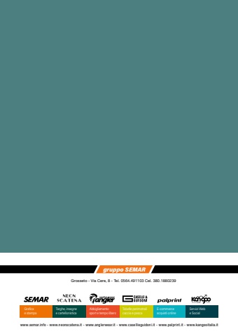 Grosseto - Via Cere, 8 - Tel. 0564.491103 Cel. 380.1880239www.semar.info - www.neonscatena.it - www.anglerwear.it - www.casellieguidoni.it - www.palprint.it - www.kangooitalia.itgruppo SEMARGraficae stampaTabelle perimetralicaccia e pescaAbbigliamentosport e tempo liberoTarghe, insegnee cartellonisticaE-commerceacquisti onlineServizi Webe Social