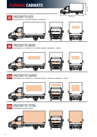 FURGONE CABINATOPACCHETTO ECO Decorazione su n. 2 portiere anteriori + posteriore.PACCHETTO BASICDecorazione su n. 2 laterali + n. 2 portiere anteriori + posteriore + cofano.PACCHETTO SUPERDecorazione su n. 2 laterali + n. 2 portiere anteriori + anteriore + posteriore + cofano.PACCHETTO TOTALDecorazione su tutto il veicoloQ2Q8Q10Q30600 cm ca.260 cm ca.8