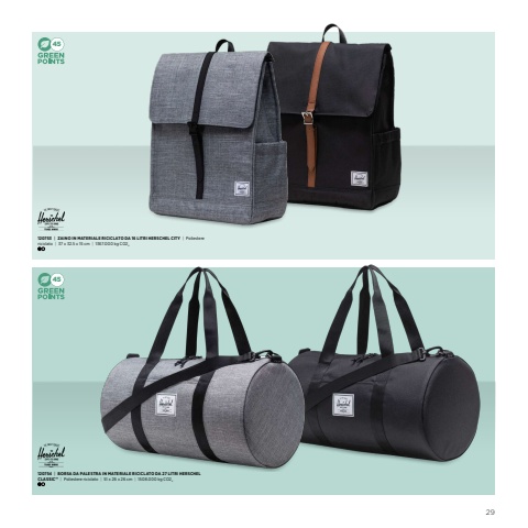 454529120754|BORSA DA PALESTRA IN MATERIALE RICICLATO DA 27 LITRI HERSCHEL CLASSIC%u2122|Poliestere riciclato|51x26x26cm|1508.000kgCO2e120753|ZAINO IN MATERIALE RICICLATO DA 16 LITRI HERSCHEL CITYPoliestere riciclato|37x32.5x15cm1367.000kgCO2e