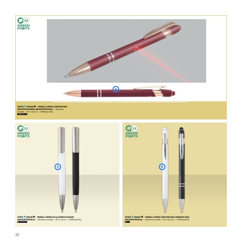 33333332107975 |106247 |PENNA A SFERA CON FINITURA ARGENTO KISH (INCHIOSTRO BLU)|Alluminio riciclato%u00d81x14.4cm0.080kgCO2e107974 |106246 |PENNA A SFERA CON FINITURA ORO ROSA NANNA (INCHIOSTRO BLU)Alluminio riciclato%u00d81x14.4cm0.080kgCO2e107971 |106129 |PENNA A SFERA IN ALLUMINIO ZIGGUR (INCHIOSTRO BLU)Alluminio riciclato|%u00d81.1x14cm0.090kgCO2e