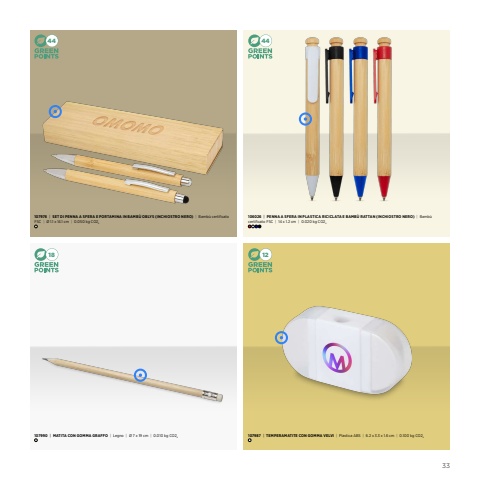 4444181233107976|SET DI PENNA A SFERA E PORTAMINA IN BAMB%u00d9 OBLYS (INCHIOSTRO NERO)|Bamb%u00f9 certificato FSC|%u00d81.1x14.1cm0.050kgCO2e106026PENNA A SFERA IN PLASTICA RICICLATA E BAMB%u00d9 RATTAN (INCHIOSTRO NERO)Bamb%u00f9 certificato FSC|14x1.2cm0.020kgCO2e107990|MATITA CON GOMMA GRAFFO|Legno|%u00d87x19cm|0.010kgCO2e107987|TEMPERAMATITE CON GOMMA VELVIPlastica ABS6.2x3.3x1.6cm|0.100kgCO2e