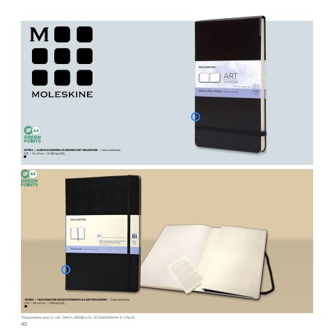 444440107954|ALBUM ACQUERELLO GRANDE ART MOLESKINECarta certificata FSC|13x21cm0.460kgCO2e107955|TACCUINO PER SCHIZZI FORMATO A4 ART MOLESKINECarta certificata FSC|29x21cm1.190kgCO2e*Disponibile solo in: UK, DACH, BENELUX, SCANDINAVIA E ITALIA