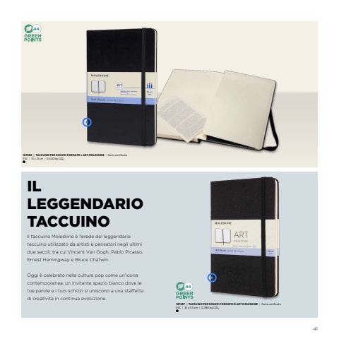 444441IL LEGGENDARIO TACCUINOIl taccuino Moleskine %u00e8 l%u2019erede del leggendario taccuino utilizzato da artisti e pensatori negli ultimi due secoli, tra cui Vincent Van Gogh, Pablo Picasso, Ernest Hemingway e Bruce Chatwin. Oggi %u00e8 celebrato nella cultura pop come un%u2019icona contemporanea, un invitante spazio bianco dove le tue parole e i tuoi schizzi si uniscono a una sta%ufffdetta di creativit%u00e0 in continua evoluzione.107956|TACCUINO PER SCHIZZI FORMATOL ART MOLESKINECarta certificata FSC|13x21cm0.520kgCO2e107957|TACCUINO PER SCHIZZI FORMATO M ART MOLESKINECarta certificata FSC18x11.5cm|0.390kgCO2e