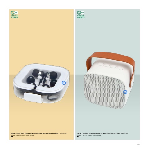 436045124438|CUFFIE TIPO C CABLATE CON ASTUCCIO IN PLASTICA RICICLATA BAEKDU|Plastica ABS riciclata|7.2x7.1x1.9cm4.660kgCO2e124436|ALTOPARLANTE WIRELESS DA 3 W IN PLASTICA RICICLATA DIYAPlastica ABS riciclata8.2x6.4x7.2cm|5.070kgCO2e