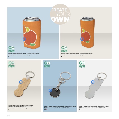 84420203648104592|PORTACHIAVI CON GETTONE PER CARRELLO DELLA SPESA RORY|Lega di zinco6x2.3x2.23cm|0.050kgCO2e104594|PORTACHIAVI CON GETTONE CARRELLO DELLA SPESA RHEA|Alluminio riciclato2.3x6.5x1cm|0.030kgCO2e1PL068|PORTALATTINE CON STAMPA A SUBLIMAZIONE DA 500 ML ADIANeoprene6x14.5cm|0.090kgCO2e1PL067|PORTALATTINE CON STAMPA A SUBLIMAZIONE DA 330 ML LYLE|Neoprene6x10.5cm|0.060kgCO2e104593|PORTACHIAVI IN BAMB%u00d9 CON GETTONE PER CARRELLO DELLA SPESA RONAN|Bamb%u00f9 certificato FSC|6.5x2.3x2.23cm0.010kgCO2e